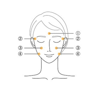 (1) Between the brows → (2) Temples → (3) Zygomatic depression → (4) Around the bite.