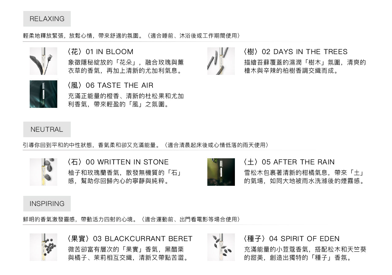 Perfumes are inspired by the myriad phenomena in nature, including rocks, flowers, breezes, trees, soil, earth and wind, injecting the energy of the earth into the depths of the soul. The pure and mellow aroma allows you to return to nature in an instant, clear your heart, and find your inner self.