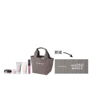所有折扣百分比均為約數。每人只享用各優惠一次。贈品種類將因存貨數量而有所更改,數量有限,送完即止。相片只供參考。優惠組合及購物禮遇不能與其他優惠同時使用。購物滿 HK$1,200 以上即享 HK$100 即時現金券折扣優惠;滿 HK$1,600 以上即享 HK$150 即時現金券折扣優惠;滿 HK$2,500 以上即享 HK$250 即時現金券折扣優惠,每筆消費交易最多可使用 5 張現金券,逾期無效。享受滿額購物禮遇,金額以折後計算 。優惠只適用於崇光啟德店 THREE 專櫃 及 崇光銅鑼灣店 THREE 專櫃,不可與其他優惠同時使用。如有任何爭議,THREE Cosmetics HK 保留最終之決定權。